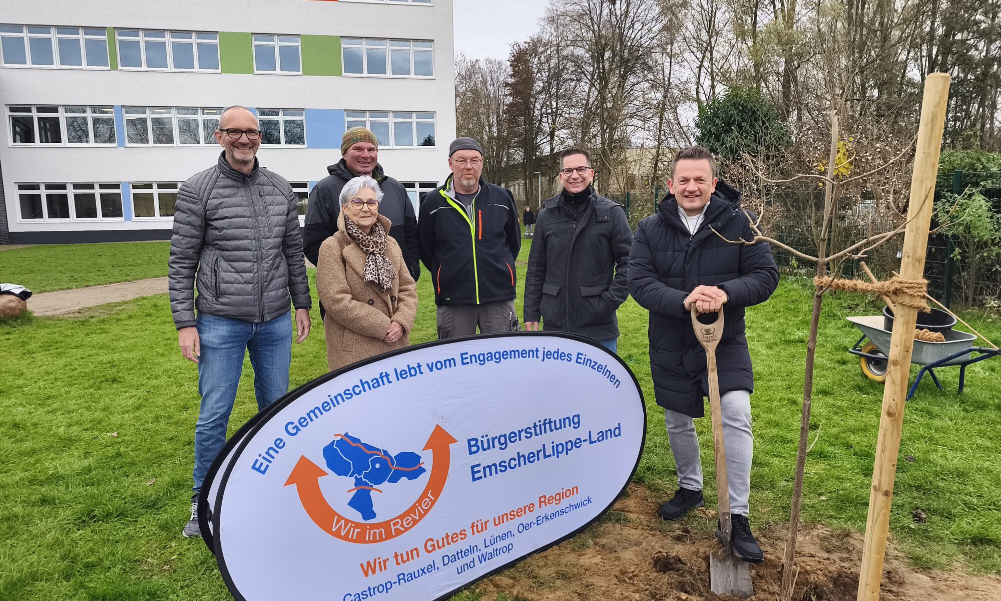 Die Wolfhelmschule in Datteln durfte am Dienstag einen besonderen Neuzugang auf ihrem Außengelände begrüßen: einen Blauglockenbaum, der von Frank Spotke gemeinsam mit der Bürgerstiftung EmscherLippe-Land gepflanzt wurde. Tatkräftige Unterstützung erhielten sie dabei von Gartenbaumeister Bernd Bolder, Robert Adam, stellv. Schulleiter, sowie Hausmeister Thorsten Gerenkamp. Mit vereinten Kräften und mehreren Spatenstichen wurde der mittlerweile 38. Stiftungsbaum in der Emscher-Lippe-Region fest verankert.